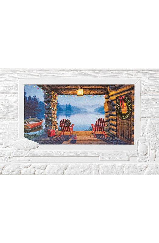 A cozy cabin sits along a foggy lake in the early morning of opening day