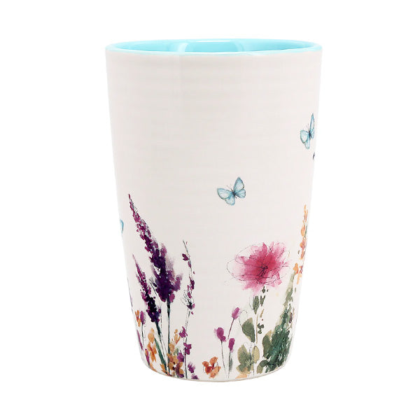 IN-HOUSE DESIGN: Beautiful springtime patterns. Pink, green, blue, pink & yellow floral patterns wrap around the bottom half with several blue butterflies. "Nurses Have Healing Hands And A Caring Heart" sentiment is on the front side of the cup. The mug's interior is light blue, whereas the exterior is creamy white.